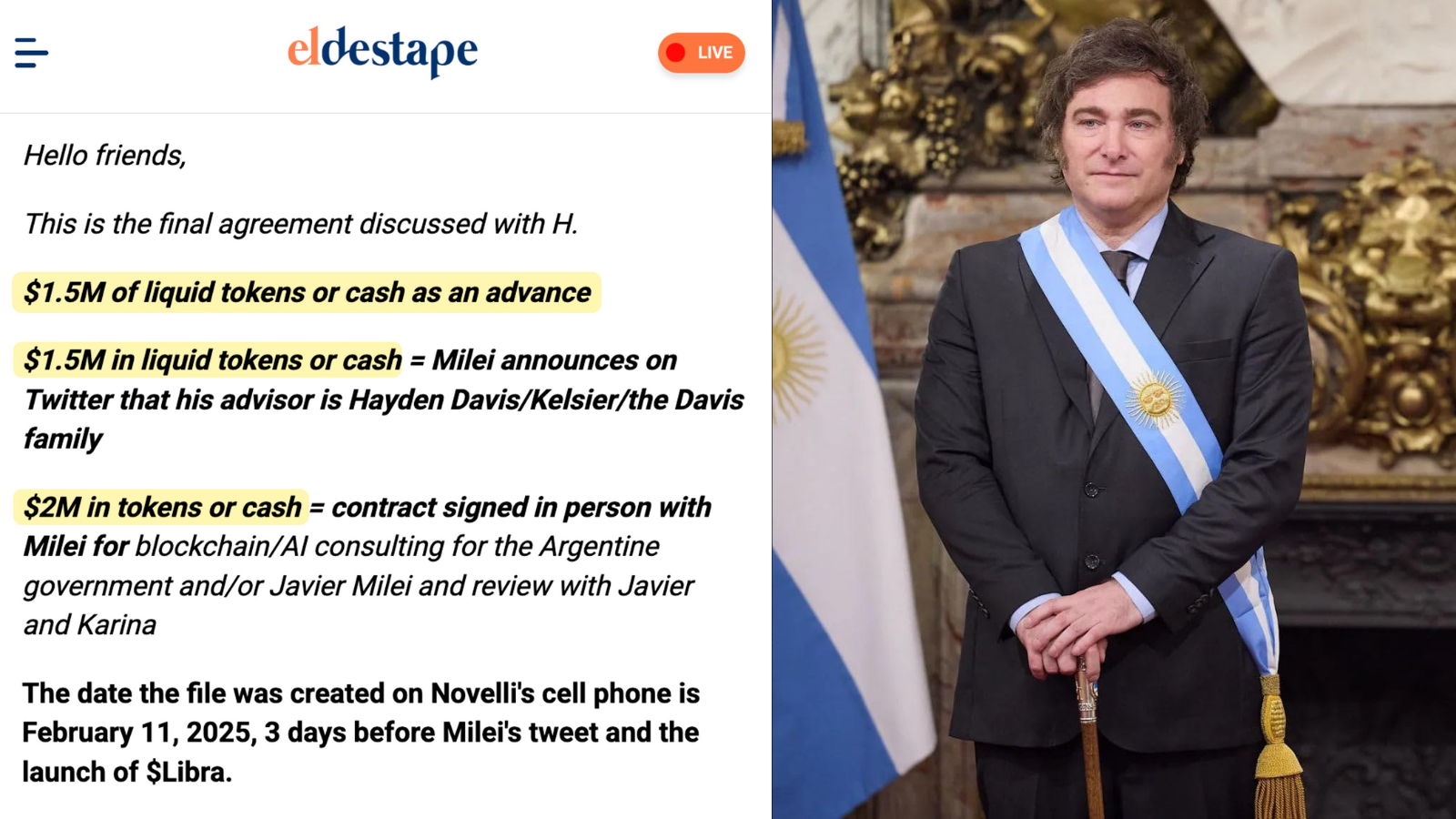 In the never-ending scandal of Javier Milei's memecoin launch $LIBRA. New evidence has surfaced just a few days back, showing a $5M deal between Milei and Hayden Davis. Middleman Mauricio Novelli's phone has been searched and evidence collected.