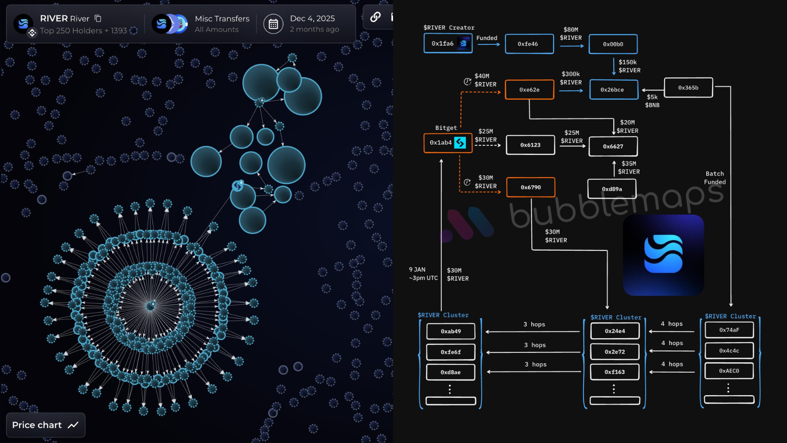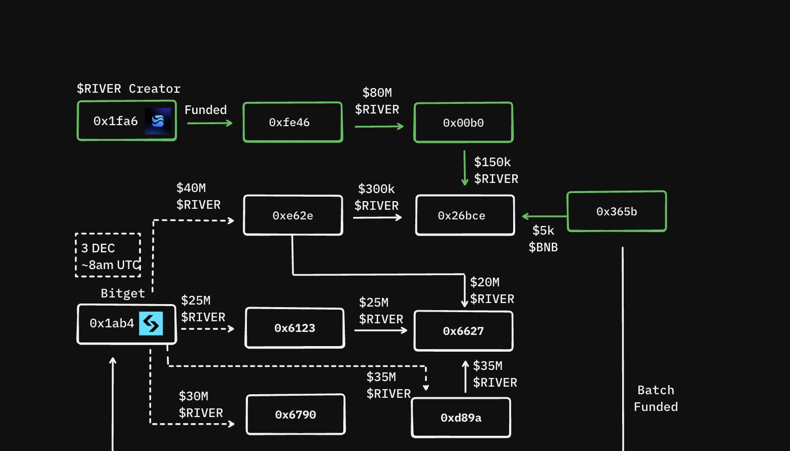 One month after launch, 7 addresses withdrew $230M $RIVER from Bitget. One of the wallets, spread 400k $RIVER across hundreds of wallets.