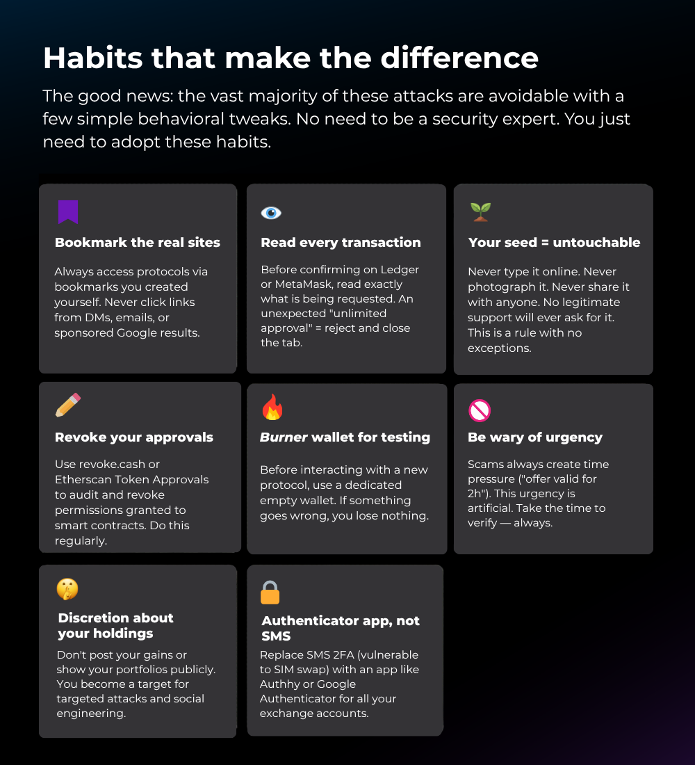 A single read can prevent an irreversible loss. In crypto, there is no going back. The security of your assets depends entirely on your own discipline.
